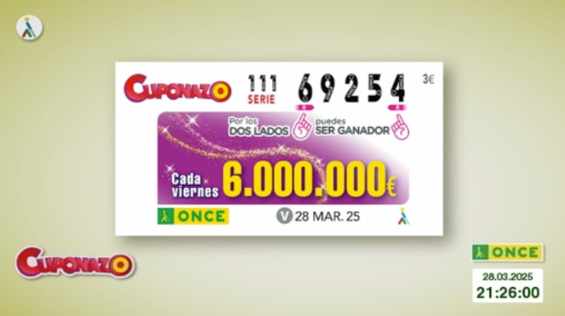 El sorteo del Cuponazo de la ONCE correspondiente al viernes 28 de marzo de 2025, que tuvo como número premiado el 69254, con la serie correspondiente al 111. Todos los resultados al completo, tanto de hoy como de fechas anteriores, los podrás ver en la web de ESTADIO Deportivo, siendo recomendable su comprobación también en los canales oficiales de la ONCE.
