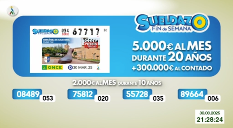 El sorteo del Cupón Diario de la ONCE correspondiente al domingo 30 de marzo de 2025 se convirtió en algo único para la persona o personas que tenían en su poder el cupón con el número premiado, que al ser sábado era especial, puesto correspondía al del Sueldazo de la Once. Todos resultados al completo, tanto de este sábado como de días anteriores, los podrás ver en la web de ESTADIO Deportivo, siendo recomendable su comprobación también en los canales oficiales de la ONCE. El Sueldazo del fin de semana tiene unos premios distintos a los del Cupón Diario. La primera extracción se lleva 5.000 al mes durante 20 años y un premio de 300.000 euros al contado, mientras que las otras cuatro ganan un sueldo de 2.000 euros al mes durante 10 años.