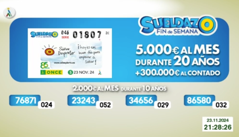El sorteo del Cupón Diario de la ONCE correspondiente al sábado 23 de noviembre de 2024 se convirtió en algo único para la persona o personas que tenían en su poder el cupón con el número premiado, que al ser sábado era especial, puesto correspondía al del Sueldazo de la Once. Todos resultados al completo, tanto de este sábado como de días anteriores, los podrás ver en la web de ESTADIO Deportivo, siendo recomendable su comprobación también en los canales oficiales de la ONCE. El Sueldazo del fin de semana tiene unos premios distintos a los del Cupón Diario. La primera extracción se lleva 5.000 al mes durante 20 años y un premio de 300.000 euros al contado, mientras que las otras cuatro ganan un sueldo de 2.000 euros al mes durante 10 años.