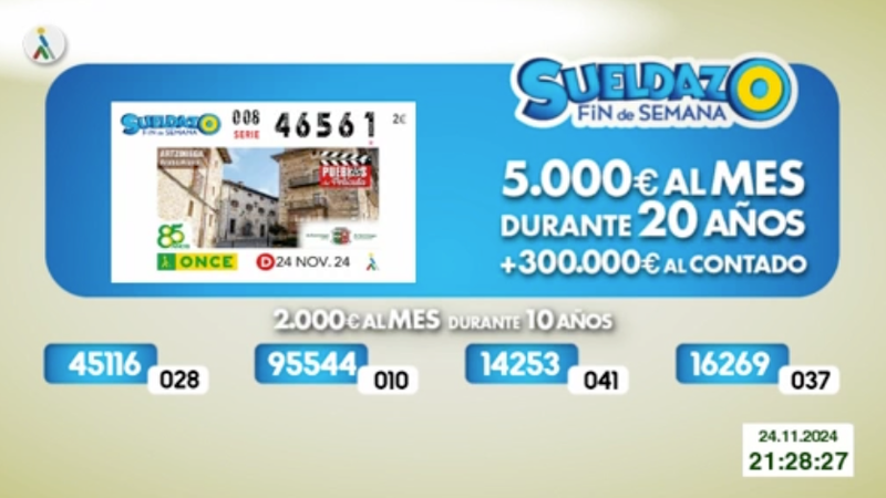 El sorteo del Cupón Diario de la ONCE correspondiente al domingo 24 de noviembre de 2024 se convirtió en algo único para la persona o personas que tenían en su poder el cupón con el número premiado, que al ser domingo era especial, puesto correspondía al del Sueldazo de la Once. Todos resultados al completo, tanto de este domingo como de días anteriores, los podrás ver en la web de ESTADIO Deportivo, siendo recomendable su comprobación también en los canales oficiales de la ONCE. El Sueldazo del fin de semana tiene unos premios distintos a los del Cupón Diario. La primera extracción se lleva 5.000 al mes durante 20 años y un premio de 300.000 euros al contado, mientras que las otras cuatro ganan un sueldo de 2.000 euros al mes durante 10 años.
