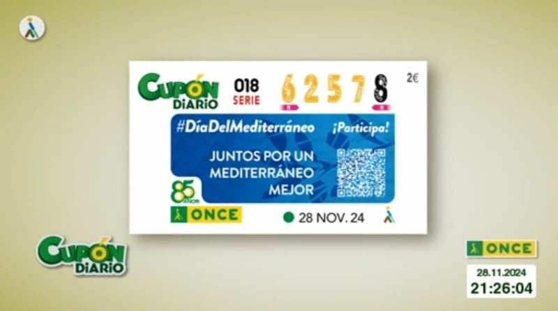 El sorteo del Cupón Diario de la ONCE correspondiente al jueves 28 de noviembre de 2024 tuvo como número premiado el 62578, con la serie correspondiente al 018. Todos los resultados al completo, tanto de hoy como de fechas anteriores, los podrás ver en la web de ESTADIO Deportivo, siendo recomendable su comprobación también en los canales oficiales de la ONCE.