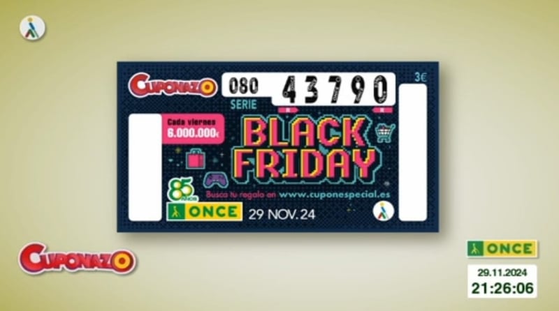 El sorteo del Cupón Diario de la ONCE correspondiente al viernes 29 de noviembre de 2024 tuvo como número premiado el 43790, con la serie correspondiente al 080. Todos los resultados al completo, tanto de hoy como de fechas anteriores, los podrás ver en la web de ESTADIO Deportivo, siendo recomendable su comprobación también en los canales oficiales de la ONCE.