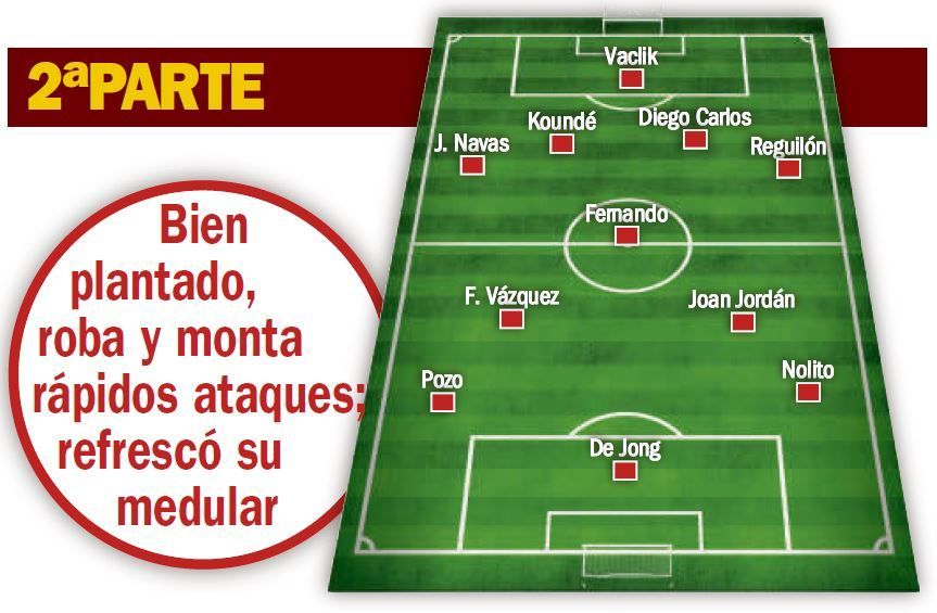 Salía además la Real tocando con velocidad y precisión, montando rápidas contras ante un Sevilla incómodo que, sin embargo, encontró el gol en una acción de calidad. El tanto sirvió de estímulo y, ahora sí, el cuadro blanquirrojo comenzó a mandar. Firme atrás y con Fernando de escoba, Óliver se movía con libertad para buscar superioridad en los costados y los nervionenses conseguían abrir el campo y poner un buen puñado de centros. Es lo lógico cuando tienes un delantero como De Jong, aunque el holandés casi siempre estaba solo en el área.