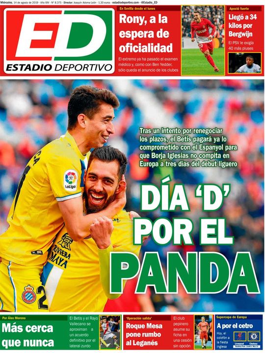 DÍA 'D' POR EL PANDA. Tras un intento por renegociar los plazos, el Betis pagará ya lo comprometido con el Espanyol para que Borja Iglesias no compita en Europa a tres días del debut liguero.