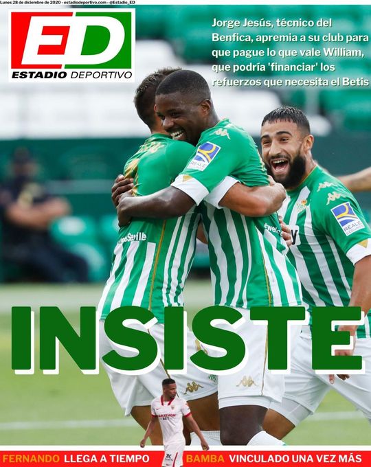 La portada de ESTADIOINSISTEJorge Jesús, técnico del Benfica, apremia a su club para que pague lo que vale William, que podría 'financiar' los refuerzos que necesita el Betis FERNANDOLlega a tiempo para ser de la partida BAMBAVinculado una vez másCompártela en: