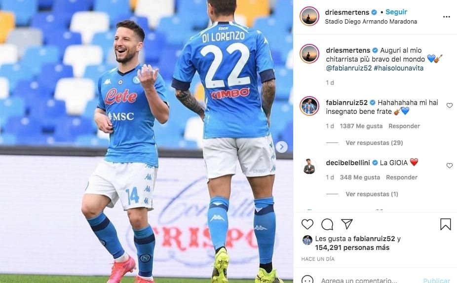 Se ha convertido en el primer jugador belga en superar los 100 goles en la Serie A, todo un logro. Y este fin de semana ha celebrado su tanto al Crotone, que ayudó en el triunfo del Nápoles por 4-3, con una dedicatoria a su compañero Fabián. De esta forma, Dries Mertens (33) festejó su acierto simulando que tocaba un instrumento muy español, gesto que explicó posteriormente en su perfil de Instagram: "Mis mejores deseos para el mejor guitarrista del mundo @fabianruiz52 #haysolounavida". El propio palaciego le contestaba: "Me enseñaste bien, hermano".