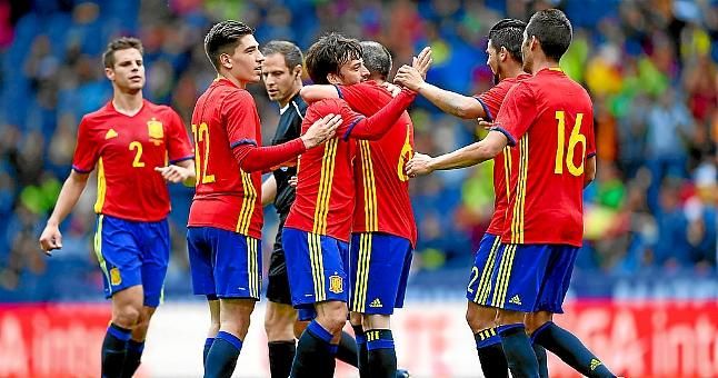 1. Iker Casillas; 2. César Azpilicueta; 3. Gerard Piqué; 4. Marc Bartra; 5. Sergio Busquets; 6. Andrés Iniesta; 7. Álvaro Morata; 8. Koke; 9. Lucas Vázquez; 10. Cesc Fábregas; 11. Pedro Rodríguez; 12. Héctor Bellerín; 13. David De Gea; 14. Thiago Alcantara; 15. Sergio Ramos; 16. Juanfran Torres; 17. Mikel San José; 18. Jordi Alba; 19. Bruno Soriano; 20. Aritz Aduriz; 21. David Silva; 22. Nolito; 23. Sergio Rico.