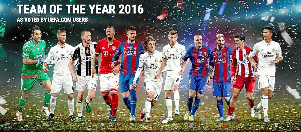 El once ideal de la UEFA está formado por Buffon; Sergio Ramos, Boateng, Bonucci, Piqué; Modric, Kroos, Iniesta; Messi, Griezmann y Cristiano Ronaldo.