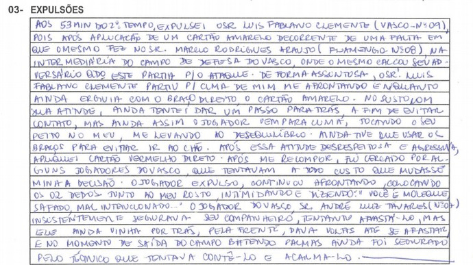 "Después de los 53 minutos, el Sr. Luis Fabiano Clemente (Vasco 9), después de mostrarle una tarjeta amarilla debido a la falta que le cometió sobre Márcio Araújo (Flamengo Nº 8 ), de forma maliciosa el sr. Luis Fabiano Clemente se enfrentó conmigo al mismo tiempo que yo llevaba una tarjeta amarilla en el brazo derecho. Por miedo con su actitud, incluso traté de dar un paso atrás para evitar el contacto, pero aun así el jugador viene, toca su pecho con el mío y me lleva al desequilibrio. Tuve que usar los brazos para evitar irme al suelo tras esta actitud irrespetuosa y agresiva. Le saqué la tarjeta roja directa, después recuperar el equilibrio y, pese a estar rodeado por algunos jugadores de Vasco, el jugador expulsado continuó el enfrentamiento, colocando dos dedos en mi cara, intimidándome y diciendo "Usted es un poco femenino, travieso, perro...". El jugador de Vasco sr. André Luiz Tavares (7) se acercó en varias ocasiones a su compañero, tratando de alejarlo, pero aun así se acercó por detrás y por delante, aplaudiendo a su salida del campo. Ahí trató fue su técnico, que estaba tratando de contenerle y calmarle", escribió.