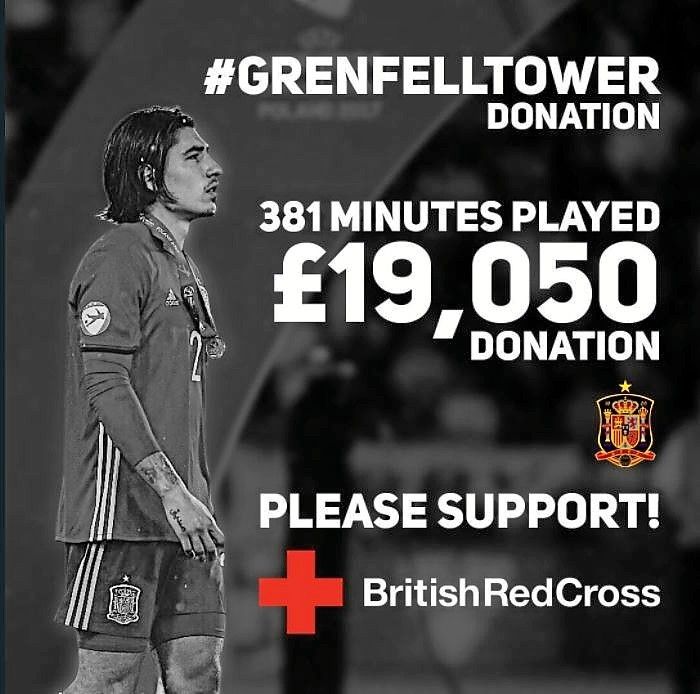 Bellerín prometió ayudar a las víctimas con cincuenta libras por minuto jugado en el último Campeonato de Europa sub 21 disputado en Polonia, en el que España se proclamó subcampeona.