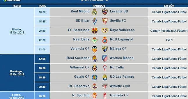 La jornada comenzará con el choque entre el Real Madrid y el Levante, que se disputará también el sábado pero a las 16 horas, y finalizará el lunes con el partido que enfrentará a Sporting y Granada, a las 20.30 horas. El sábado a las 20.30 horas se jugará uno de los choques de altura de esta octava fecha entre el FC Barcelona y el Rayo Vallecano.