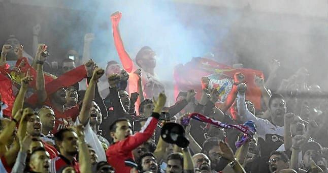 Los aficionados del conjunto lisboeta arrojaron las bengalas a la grada inferior del Fondo Norte después de que el argentino Gaitán marcase el primer tanto de los visitantes, que igualaba al del Atlético y ponía el empate a uno en el marcador, en el minuto 36. Ese incidente obligó a parar el partido durante un par de minutos.