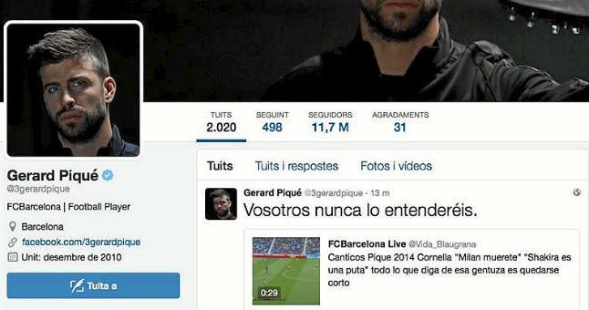 El jugador del FC Barcelona Gerard Piqué ha publicado este viernes por la mañana un tweet con la frase "Vosotros nunca lo entenderéis" y un vídeo enlazado de un resumen de los insultos que parte de la afición del RCD Espanyol le propinó a él, a su pareja Shakira y al primer hijo de ambos, en el derbi de Liga del 29 de marzo de 2014 en Cornellà, escudando en ellos sus últimas declaraciones de la "maravillosa minoría".