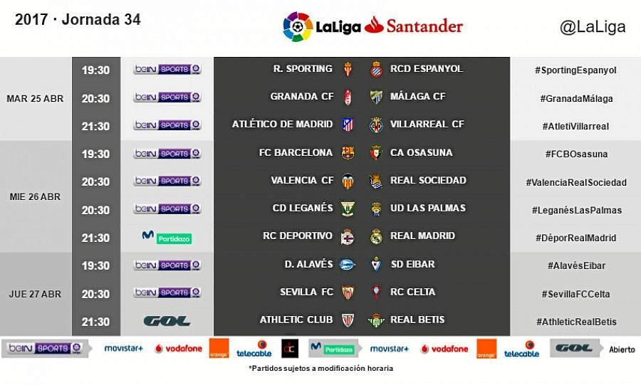 El Real Madrid visitará al Deportivo de La Coruña el miércoles 26 de abril a las 21.30 horas, mismo día en el que el FC Barcelona recibirá a Osasuna (19.30), de acuerdo a los horarios de la jornada 34 de LaLiga Santander anunciados este lunes.