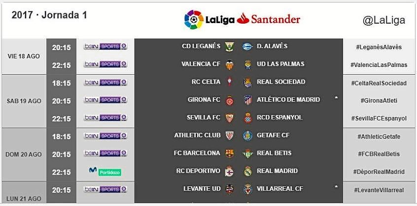 LaLiga ya ha publicado los horarios correspondientes a la primera jornada de campeonato de Liga 2017/18.