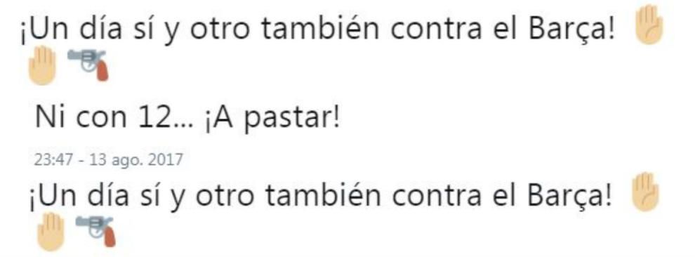 A la conclusión del partido cerró con dos tuits atacando al Barcelona tras el 1-3 en favor del Real Madrid. "Ni con 12, a pastar", escribió antes de "visto esto podríamos aprovechar y jugar el Trofeo Bernabéu el miércoles, no?", bromeando con la vuelta de la Supercopa de España tras dejar encarrilado el título.