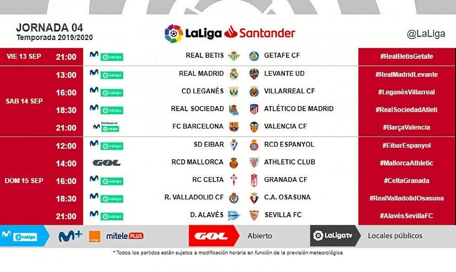 LaLiga ha revelado en la tarde de hoy los horarios de la cuarta jornada de la competición doméstica, la cual se celebrará tras el primer parón de selecciones de la temporada.