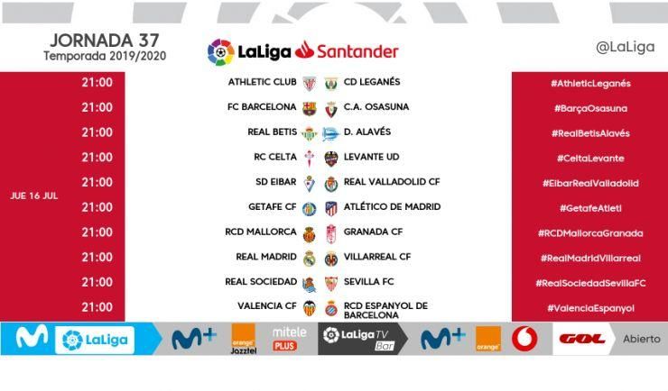 En cuanto la última jornada, todos los partidos se jugarán también el domingo 19 de julio a las 21:00 horas, aunque LaLiga podría modificar el día y la hora en caso de que no haya nada en juego en alguno de los partidos que se disputen. El Betis visitará Zorrilla para medirse al Valladolid mientras que el Sevilla recibirá en el Sánchez-Pizjuán al Valencia.