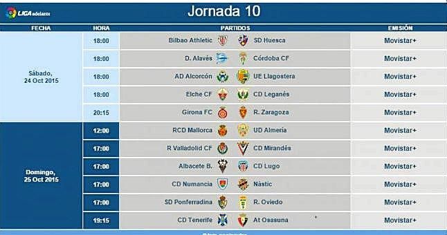 Ya están disponibles los horarios de los partidos de la 10ª jornada de la Liga Adelante, que se disputará entre el 24 y el 25 de octubre.