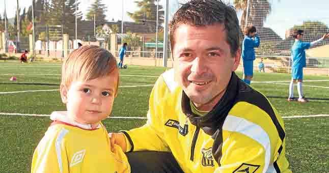El mediocentro coriano Víctor Salas posa con su hijo.Juan Esteban López