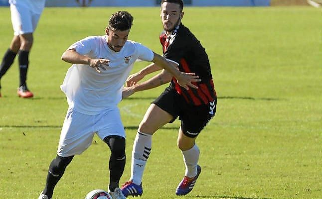 Giráldez conduce el esférico ante la presión de Bucarat en el Sevilla C-Cabecense.Carlos Vizcaíno