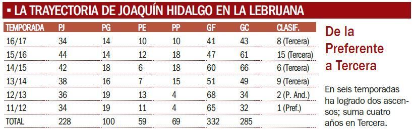 A estas alturas pocos dudan de que Joaquín Hidalgo es el mejor entrenador de la historia de la Balompédica Lebrijana. No es cuestión de gustos u opiniones, sino de estadísticas. A su llegada en la 11/12, en la extinta Preferente Sevillana, se propuso llevar al cuadro albiceleste, en un segundo plano durante muchas temporadas tras el Antoniano, a un lugar futbolístico relevante y lo logró, ya que el equipo lebrijano cumple su cuarta temporada en Tercera división en la que salvo la pasada, en la que se salvó in extremis, no ha pasado desapercibido.