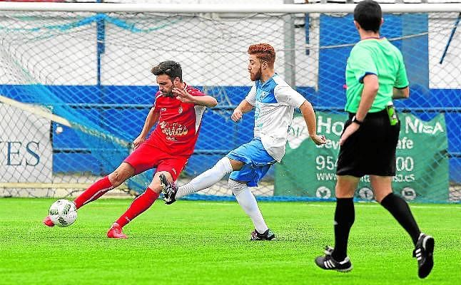 El centrocampista Peli, que seguirá otro curso más en el Castilleja, presiona al utrerano Titi.R. C.
