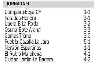 Como segundo clasificado aparece el Paradas, que hizo los deberes ante el Herrera (3-1) y aprovechó a su vez el pinchazo del Arahal, que no pasó del empate ante el Osuna, en un entretenido partido (3-3), y cedió así su puesto de privilegio.