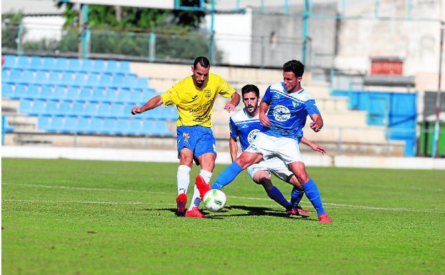 Curro Pérez (derecha), junto a Moyita, presiona a un rival del UD San Fernando, en la ida de la segunda ronda de los ´play off´ de ascenso 16/17.Carlos Vizcaíno