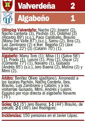 Debutaba Santizo en el banquillo de la Valverdeña y lo hizo con victoria. El Algabeño, que logró lo más difícil adelantándose en el marcador por medio de Jero Baena, vio como su rival le daba la vuelta al marcador con dos zarpazos a final de la primera mitad y justo al comenzar la segunda. Además, la expulsión de Navarro, en el minuto 75', frenó cualquier aspiración algabeña para la igualada.