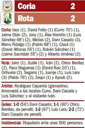 El partido se torció para los ribereños con el penalti señalado por el granadino Rodríguez Caparrós y transformado por Chico Benítez, cuando tan solo cuatro minutos antes Dani Casado había adelantado a los corianos en el marcador. A partir de aquí, los hombres de 'Puma' perdieron el sitio sobre el rectángulo de juego, lo cual iba a ser aprovechado por Luis Lara en el minuto 67 para culminar una buena contra gaditana y batir de tiro raso al guardameta Isco. El Rota, con este resultado de ventaja mínima para sus intereses, dio un paso atrás volcándose todo el equipo amarillo en busca de la igualada que llegaría en el minuto 72 tras ser objeto de un claro penalti Jaime Sacristán. El encargado de transformar la pena máxima fue, de nuevo, Dani Casado.