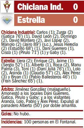 Meritorio punto el conseguido por la Estrella en la casa del Chiclana Industrial, pero que no sirve para eludir el descenso. Los panaderos dominaron el encuentro hasta la expulsión de Alberto al inicio de la segunda mitad, por lo que el empate logrado se vio con buenos ojos.