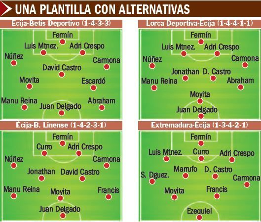 De vuelta al San Pablo, primer empate. El Écija sumó un punto frente a la Balompédica Linense con el sistema que, quizá, puede ser el más empleado por las características de la plantilla: 1-4-2-3-1. La gran novedad fue la titularidad de Francis como extremo zurdo.