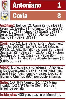 Zarpazo del Coria al Antoniano que supo golpear en la recta final del choque para llevarse tres puntos ante un rival directo por el ascenso. Tras una primera mitad llena de ocasiones para ambas escuadras, los dos equipos dejaron toda la pólvora para los segundos cuarenta y cinco minutos. Iba a golpear primero el Antoniano con una soberbia falta directa ejecutada por Alonso, pero sin apenas tiempo para saborear el gol, el Coria empataba por medio de Manu Fidalgo tras pase magistral de Cissé. Las fuerzas se volvían a igualar. Sin embargo, los de Puma dieron un paso adelante y pusieron el 1-2 y el 1-3 en menos de diez minutos con goles de Otón y de Israel, de penalti.