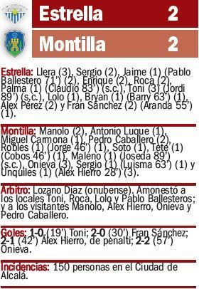 Empate con sabor a derrota tras dejarse igualar la Estrella un marcador de 2-0. Ayer era el momento clave para despegar de la zona de descenso y el equipo salió enchufado por el objetivo. Toni, que volvió a jugar de nueve, hizo el primero y Fran Sánchez, en el 30', colocaba el segundo en el luminoso. Todo se ponía cuesta abajo, pero dos fallos defensivos metieron al Montilla en el encuentro y dejaron depresivos a los locales.