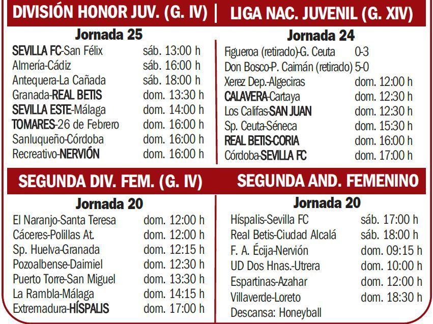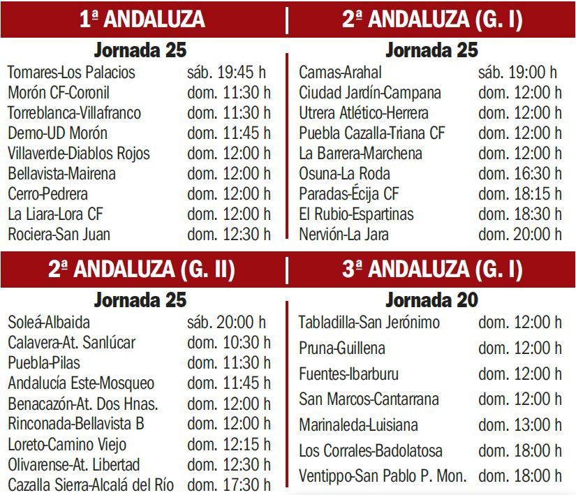 Os ofrecemos a continuación los horarios de Primera, Segunda y Tercera Andaluza , las divisiones juveniles y las femeninas.