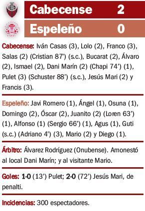 El Cabecense ha podido dar un golpe casi definitivo a la permanencia tras la justa victoria de ayer ante un Espeleño al que le corta las alas, ya que llegaba con tres jornadas consecutivas sin perder y con el anhelo de meter presión a los rojinegros. Sin embargo, los de Antonio Jesús Falcón firmaron un gran encuentro, dominando desde el comienzo y encarrilándolo por medio de Pulet. Los ugienses controlaron el choque, sentenciado en el 72' por medio de un penalti de Jesús Mari.