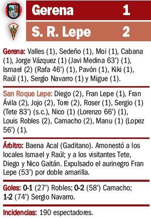 El Gerena, que no aprovechó sus opciones, encadenó su cuarta jornada sin ganar ante un San Roque de Lepe efectivo. Los leperos se marcharon con 0-1 al descanso y el gerenense Sergio Navarro, en el 53', falló un penalti, acción que supuso la expulsión de Lepe. Camacho hizo el 0-2 y Sergio Navarro puso emoción en el 74'.