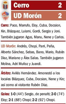 Un doblete de Chopi, en el 88' y en el añadido, dejó con la miel en los labios al Cerro, que queda muy lejos ya del liderato, y le otorgó un punto vital a la UD Morón en su persecución al Torreblanca.