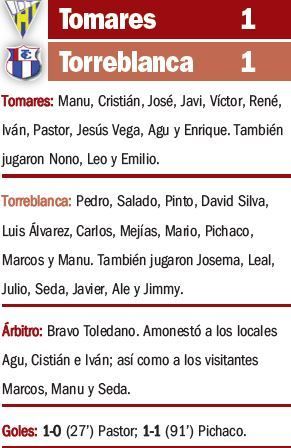 Un remate de Pichaco en el 91' tras una falta lanzada por Javier permitió al Torreblanca empatar ante el Tomares y, de paso, sumar 22 jornadas sin perder. Los aljarafeños se adelantaron por medio de Pastor, que culminó una buena jugada por la izquierda.