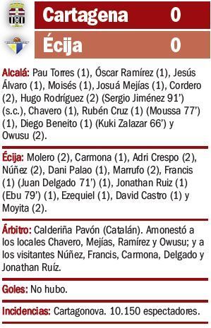 El Écija sufrió el peor desenlace posible después de empatar en Cartagonova ante un Cartagena al que le valía el empate para ser primero de grupo. Al Écija también le valía el punto en ciertos tramos, pero se conformó con una promoción de descenso que acabó convirtiéndose en la pérdida de categoría de forma matemática.