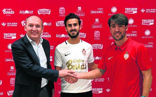 Antonio Camino, presidente del Utrera, Marrufo, último fichaje de los utreranos e Israel Bascón, director deportivo del club de San Juan Bosco.Carlos Vizcaíno