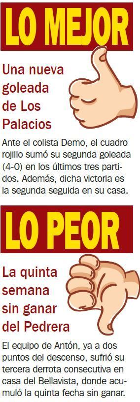 En la zona baja, sigue la pugna en el límite de la zona de descenso entre Los Palacios y Camino Viejo. Continúa la ventaja de un punto de los primeros sobre los segundos, tras sus respectivas victorias ante Demo y Alcalá del Río, dos rivales que continúan copando los dos últimos puestos. Paralelamente, Coronil y Lora firmaron un empate que los mantiene en la zona media.