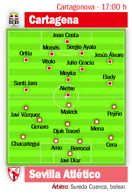 El Sevilla Atlético se enfrenta al complicado reto de asaltar el feudo del líder, un Cartagena que acumula doce jornadas sin perder, en las cuales solo ha cedido dos igualadas.Más allá de la dificultad del rival, el gran problema de la expedición sevillista está en la enfermería, pues la lista de bajas sensibles es demasiado amplia. Curro, Juanpe y Manu Sánchez, titulares habituales, están sancionados junto a Miguel Martín, al igual que Casas, quien fue expulsado la pasada semana con el División de Honor. Asimismo, Chris Ramos, que ya no llegó al último partido, volverá a ser baja por una lesión en el gemelo, mientras que Lucho, ante los problemas de Vaclik, ha sido reclamado por Pablo Machín para un primer equipo, al que Bryan vuelve a ir convocado.