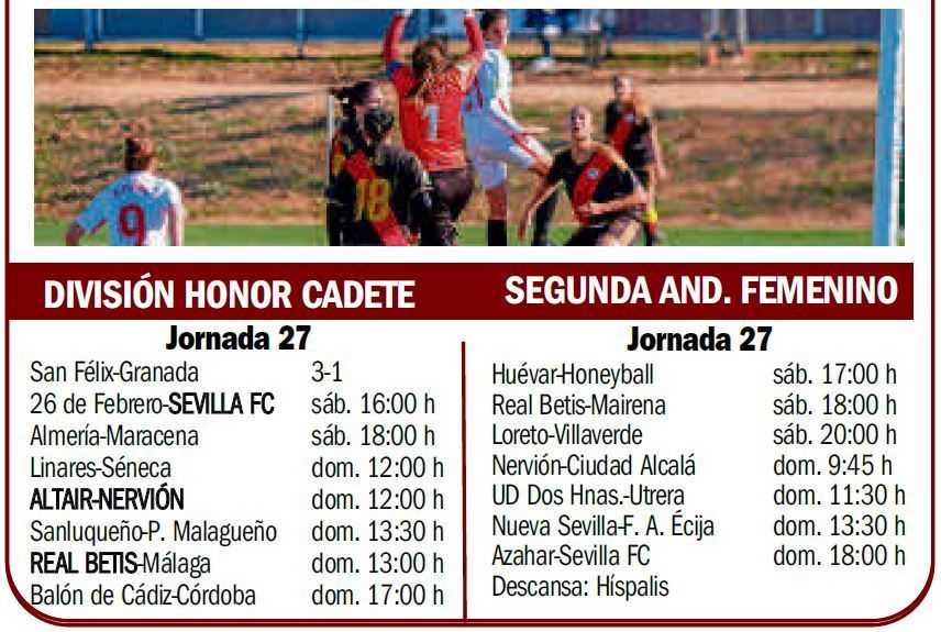 Aquí está la guía de partidos de los equipos sevillanos para este fin de semana en las diferentes categorías: 1ª Andaluza, 2ª Andaluza (G. I y II), 3ª Andaluza (G. I, II y III), División de Honor Juvenil (G. IV), Liga Nacional Juvenil (G. XIV), División de Honor Cadete y 2ª Andaluza Femenino.