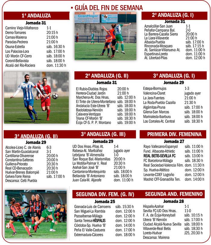 Aquí está la guía de los partidos de los equipos sevillanos este fin de semana en las diferentes categorías (1ª Andaluza, 2ª Andaluza, 3ª Andaluza, Primera división femenina, Segunda división femenina y Segunda Andaluza femenina).