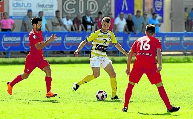 En la imagen, el lateral coriano Mario Begines, con el balón controlado, recibe la presión del utrerano Kiki, acción que observa Titi.Carlos Vizcaíno