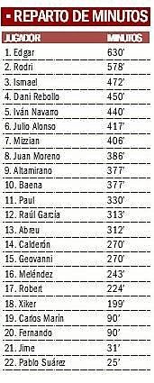 Tantos cambios han hecho que Edgar y Rodri sean los únicos jugadores que hayan partido de inicio todas las semanas, siendo el central catalán el único que contabiliza todos los minutos disputados hasta la fecha (630’). Le sigue Rodri, con 578’.