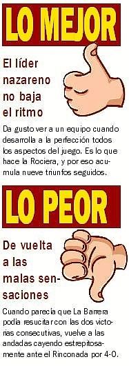 Empezando por una Rociera que ha vuelto a ganar 0-1 en casa del Pilas y acumula ya nueve triunfos consecutivos. Lidera el campeonato con 38 puntos, seis más que su perseguidor más cercano, el cual es un Morón que ha vencido de forma convincente (3-1) a un hueso duro como es el Camas, que cae noveno en la tabla con veinticuatro puntos.