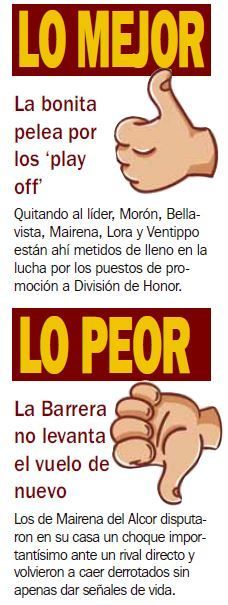 Así comenzó el fin de semana, con un Lora-Pilas que se acabaron llevando los locales por un 2-0 y que les permite seguir al acecho de los puestos de 'play off'. El Pilas está decimosexto, en descenso con trece puntos. La Rociera volvió a vencer en su feudo por 2-0 también ante el Pedrera, lo que le corta un poco las alas de escalar puestos en la clasificación. El Bellavista, con treinta y dos puntos, le vino bien el empate obtenido en casa del siempre difícil Camas (2-2) para asaltar el tercer puesto. Por último, el Morón-Ventippo fue otro de los encuentros de la parte media-alta, y finalizó con empate a uno. El Morón es segundo con treinta y tres puntos, mientras que el Ventippo es sexto con veintiocho.
